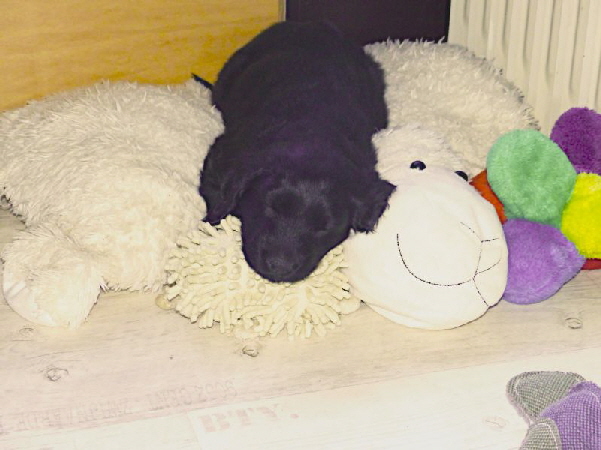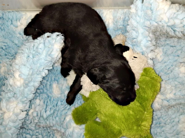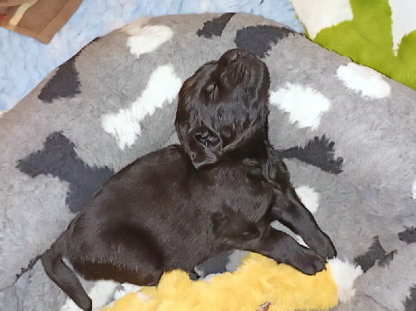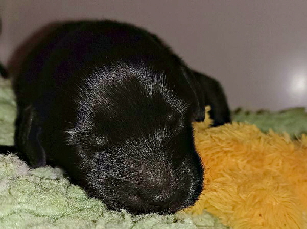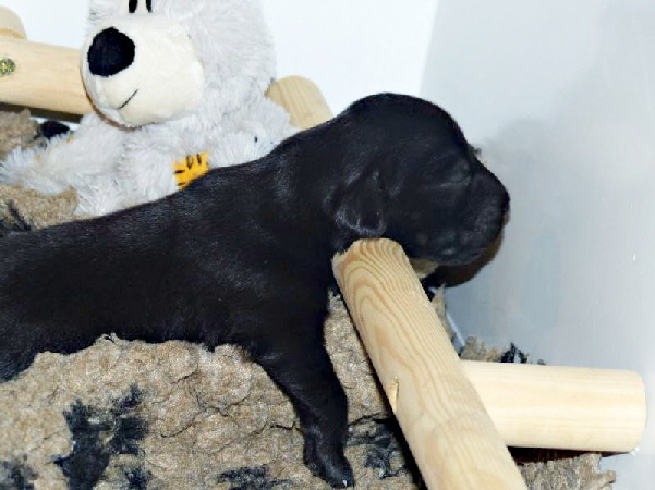 25.11.2021: Solos 2.Woche fing gut an. Er wuchs schön weiter und nahm gut zu. Auch Dana geht es gut. Sie ist weiterhin fürsorglich, nimmt sich aber auch schonmal eine kleine Auszeit, wenn der Kleine schläft. Und das tut er natürlich noch ausgiebig. Am Samstag wurde es ein wenig blöd für Solo: erste Wurmkur. Er meint: Das braucht kein Hund, widerlich! Wir meinen: Oh doch! Da er nicht flüchten kann ..., blöd gelaufen. Nun, auch das geht vorbei. Die Augen öffnen sich zunehmend, man kann die kleinen dunklen Perlchen manchmal etwas sehen. Auch mit dem Vorankommen wird es besser. Die Hinterbeine werden immer mehr eingesetzt, das sieht schon bald wie Gehen aus. Wenn Mama allerdings zum Reinigungsappell ruft, bleibt nur ‘Stillhalten’. Ansonsten ist Dana nicht zimperlich und Solo kugelt schon mal herum. Nunja, solang man wieder hochkommt.