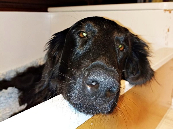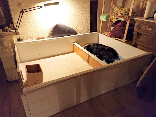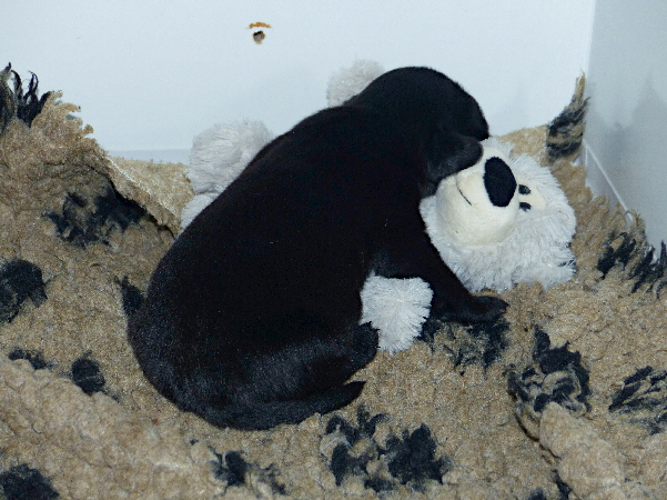 Da der Bursche nun mehr Platz braucht, wurde in der Wurfkiste umgezogen. Nun hat Solo fast doppelt soviel Platz wie zuvor und auch Dana kann sich besser strecken. So kann Solo auch schonmal den Langlauf üben.