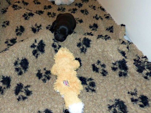 15.12.2021: Sololeinchen entdeckt die Welt. Nachdem er zunächst die ganze Wurfkiste für sich erobert hatte, gibt es nun einen kleinen Auslauf außerhalb der Box. “Wie spannend - hinter den Wänden der Box geht die Welt weiter ... Und da gibt es außer der Mama noch weitere Hunde, die man vorher zwar irgendwie wahrgenommen hatte, aber so richtig wusste man nicht. Und die sind neugierig und schnuppern, genau wie ich, und die sehen aus wie Mama. Die wollen mit mir spielen, oder?”