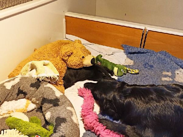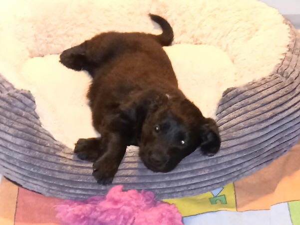 Insgesamt ist es hier natürlich deutlich ruhiger als bei den vorherigen Würfen, klar bei bisher zweistelliger Anzahl von Welpen. Die Halsbändchen liegen ungenutzt noch in Griffweite, die Wurfkiste ist sehr groß. Gut, dass wir sie verkleinern können.