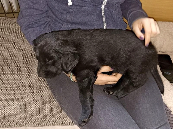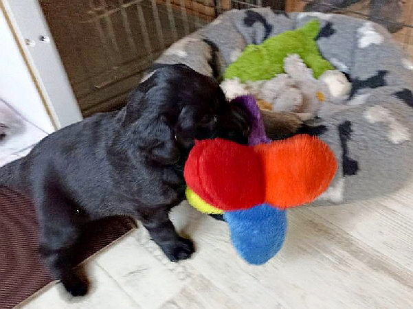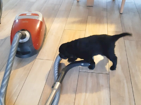 19.12.2021: Am liebsten ist Solo nun außerhalb der Wurfkiste im kleinen Auslauf. Da bekommt er viel mehr mit: die anderen Hunde, Menschen ... . Der Staubsauger interessiert ihn nun mal gar nicht. Ab und an, wenn er Seltsames wahrnimmt, bellt er mit heller Stimme - ganz schön gefährlich. Gefährlich sind auch die kleinen spitzen Zähnchen, autsch! Man sollte auch nicht die Besucher beißen, die jetzt schon da waren. Es könnten die neuen Frauchen und Herrchen dabei sein. Jedenfalls zaubert Solo den Leuten flugs ein Lächeln in’s Gesicht, einfach so. Und aufregend ist es auch. Die Leute sind natürlich begeistert. Er ist aber auch knuffig.