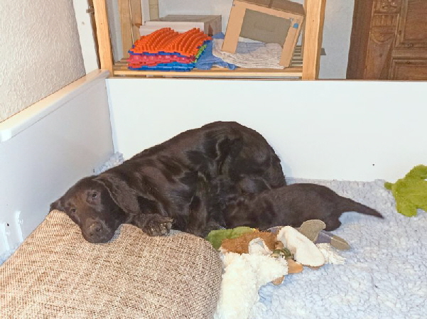 Bei den bisherigen Würfen war wegen der großen Zahl der Welpen fast immer etwas Unruhe. Wir mussten schauen, dass jeder Welpe genug zu Trinken bekam, fast ständig waren Geräusche zu hören und stets herrschte Sorge um die Kleinen. Nun richtet sich die Sorge nur auf einen Welpen. Also insgesamt ist alles deutlich ruhiger. Dana geht es gut, ihre OP-Naht ist sehr gut verheilt. Sie kümmert sich intensiv um Solo, hat aber auch Gelegenheit, sich außerhalb der Welpenkiste zu entspannen und auch mal durch den Garten zu streifen.