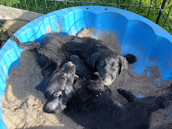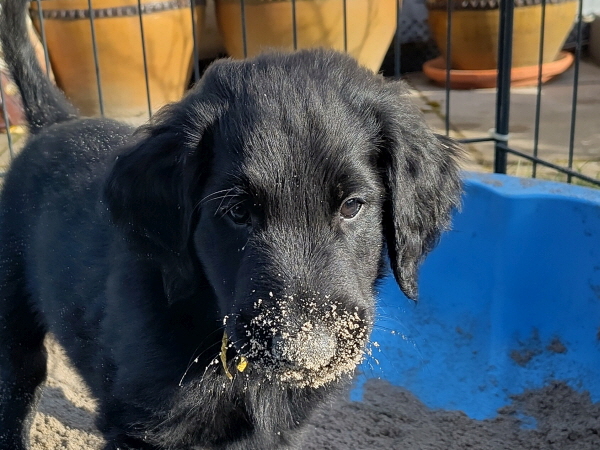 01.04.2026: Kaum zu glauben, jetzt hat schon die achte Lebenswoche der Welpen begonnen. Sie wachsen weiter schön und nehmen ordentlich zu: 5100 - 5500 Gramm. Die Besucher der letzten Tage staunten, wie groß sie geworden sind und hatten Freude beim Kuscheln und Knuddeln. In den letzten Tagen konnten die Kleinen zeitweise wieder in den Gartenauslauf, das gefällt ihnen. Heute wurde eine Sandmuschel aufgebaut und sofort eingeweiht - so ein Spaß. Morgen kommt die Tierärztin zum Drüberschauen, Impfen und Chipen. Bestimmt wird auch sie begeistert sein. Und am kommenden Samstag gibt’s hier das große Treffen, alle ‘Neuen’ kommen zu uns. Da lernt man sich kennen, tauscht sich aus und erfährt noch einiges Nützliches. Und sie erfahren, wer denn demnächst ihr Zuhause bereichert - oder so. Jedenfalls wird es ein schöner Tag.
