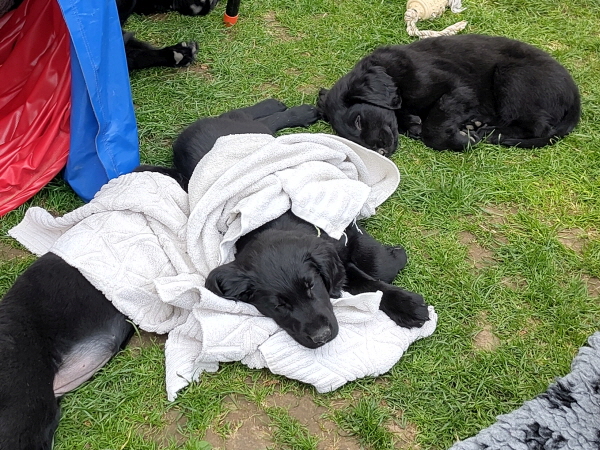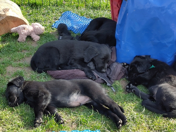Alle Welpen sind ausgeglichen und taff. Mitte der Woche dröhnte der Probealarm los: Terrassentür auf und .... nix und. Die Welpen blieben ruhig, einige schliefen weiter - cool.
