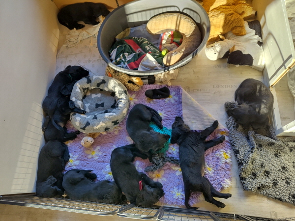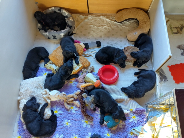 18.02.2026: 10 Tage sind sie nun schon alt, alle haben ihr Gewicht verdoppelt. Zur Anfang hatten alle 9 zusammen eine Gewicht von 3336 Gramm, nun sind es 7734 - ordentlich. Das Krabbeln ähnelt nun schon fast einem zaghaften Laufen. Alle vier Beine werden eingesetzt und der Körper hebt sich leicht vom Boden. Das Ganze doch noch recht zappelig und wackelig, aber immerhin. Wir glauben, dass bald die Augen aufgehen. Man kann bei einigen einen leichten Schlitz erahnen. Ivy macht ihre Sache weiterhin wunderbar, nimmt sich aber zunehmend eine Auszeit außerhalb der Wurfbox.