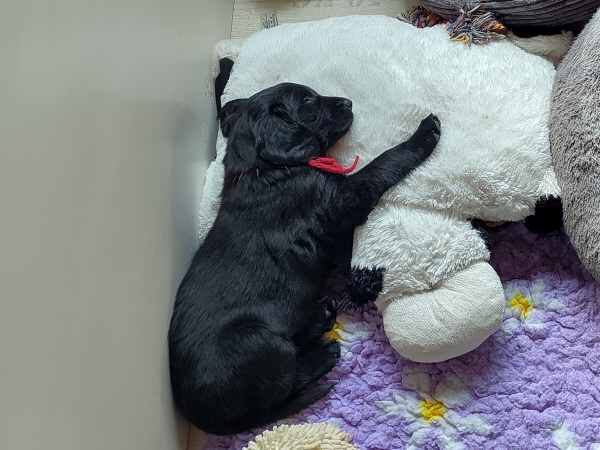 Bei uns ist Ruhe eingekehrt. Etwas wehmütig werden Auslauf innen und außen und die Wurfkiste abgebaut. Fryda fühlt sich pudelwohl. Sie läuft, mal mit den Großen, mal alleine, durch Haus und Garten und hat Spaß. Dann ist sie aber auch müde und schläft ausführlich.