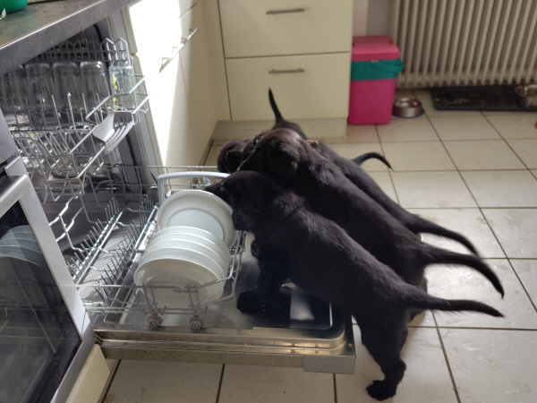 Die Welpen sind weiterhin putzmunter, kräftig, pfiffig und agil. Sie wiegen nun 6000 Gramm und mehr. Noch zweimal schlafen und es wird schon ein wenig leerer in der Wurfkiste.