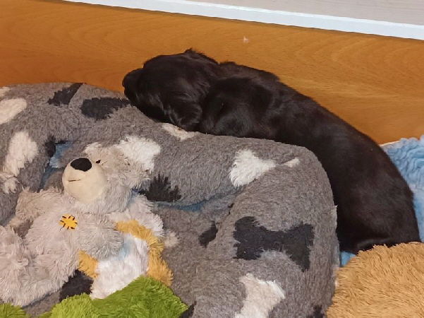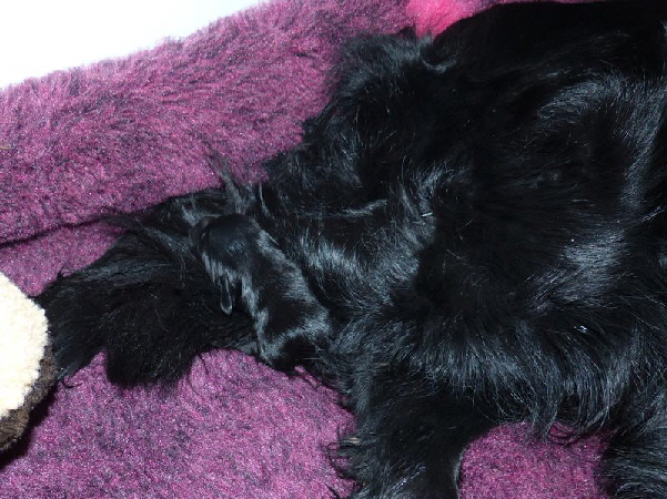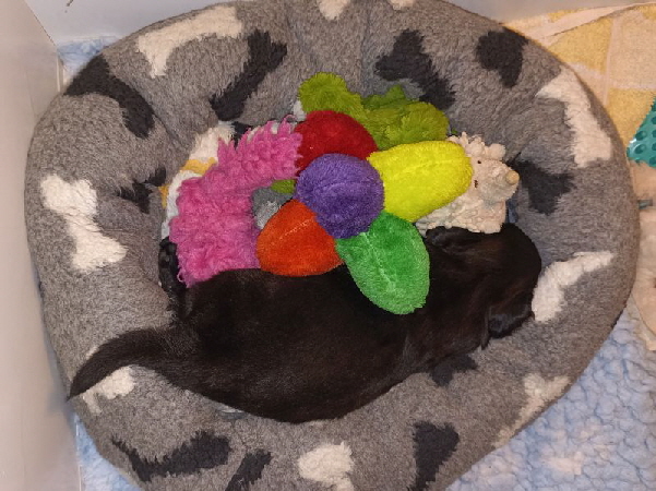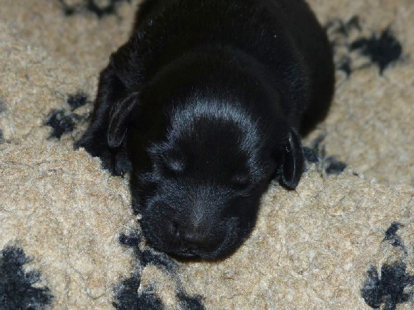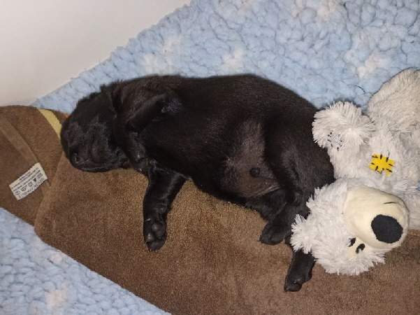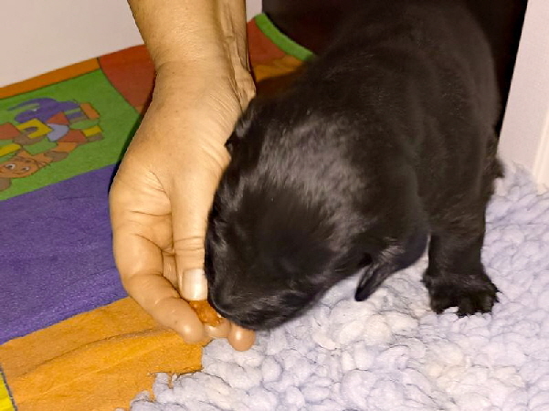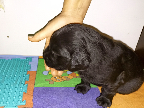 25.11.2021: Solos 2.Woche fing gut an. Er wuchs schön weiter und nahm gut zu. Auch Dana geht es gut. Sie ist weiterhin fürsorglich, nimmt sich aber auch schonmal eine kleine Auszeit, wenn der Kleine schläft. Und das tut er natürlich noch ausgiebig. Am Samstag wurde es ein wenig blöd für Solo: erste Wurmkur. Er meint: Das braucht kein Hund, widerlich! Wir meinen: Oh doch! Da er nicht flüchten kann ..., blöd gelaufen. Nun, auch das geht vorbei. Die Augen öffnen sich zunehmend, man kann die kleinen dunklen Perlchen manchmal etwas sehen. Auch mit dem Vorankommen wird es besser. Die Hinterbeine werden immer mehr eingesetzt, das sieht schon bald wie Gehen aus. Wenn Mama allerdings zum Reinigungsappell ruft, bleibt nur ‘Stillhalten’. Ansonsten ist Dana nicht zimperlich und Solo kugelt schon mal herum. Nunja, solang man wieder hochkommt.