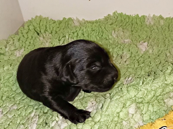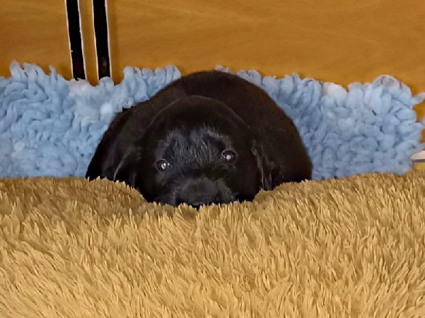 15.12.2021: Sololeinchen entdeckt die Welt. Nachdem er zunächst die ganze Wurfkiste für sich erobert hatte, gibt es nun einen kleinen Auslauf außerhalb der Box. “Wie spannend - hinter den Wänden der Box geht die Welt weiter ... Und da gibt es außer der Mama noch weitere Hunde, die man vorher zwar irgendwie wahrgenommen hatte, aber so richtig wusste man nicht. Und die sind neugierig und schnuppern, genau wie ich, und die sehen aus wie Mama. Die wollen mit mir spielen, oder?”