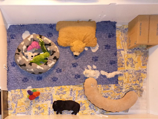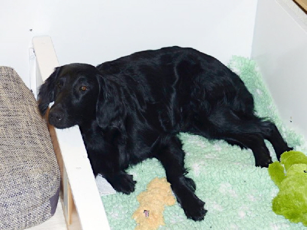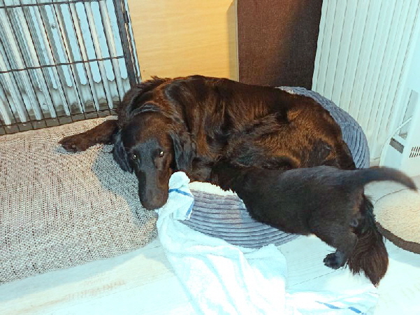 Da der Bursche nun mehr Platz braucht, wurde in der Wurfkiste umgezogen. Nun hat Solo fast doppelt soviel Platz wie zuvor und auch Dana kann sich besser strecken. So kann Solo auch schonmal den Langlauf üben.