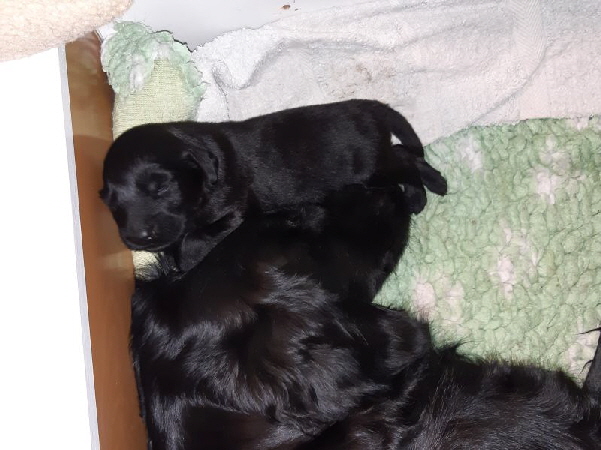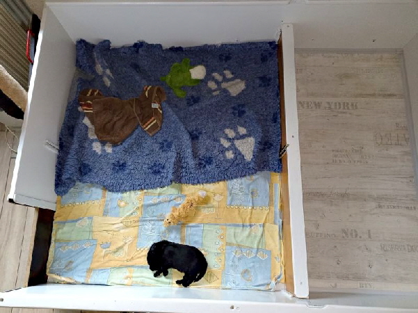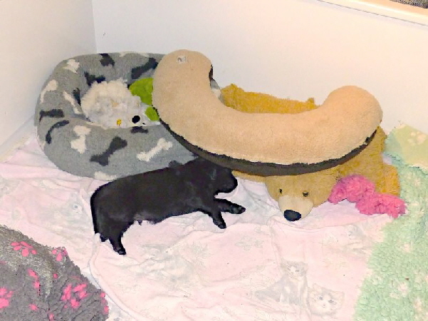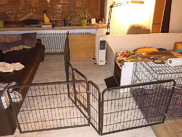 Insgesamt ist es hier natürlich deutlich ruhiger als bei den vorherigen Würfen, klar bei bisher zweistelliger Anzahl von Welpen. Die Halsbändchen liegen ungenutzt noch in Griffweite, die Wurfkiste ist sehr groß. Gut, dass wir sie verkleinern können.