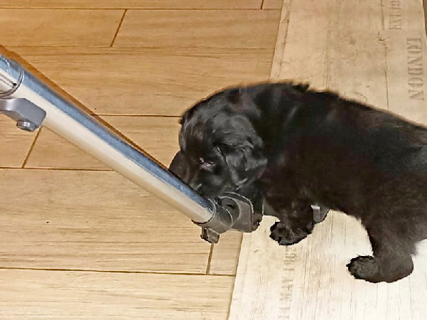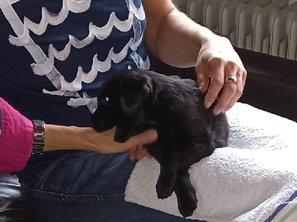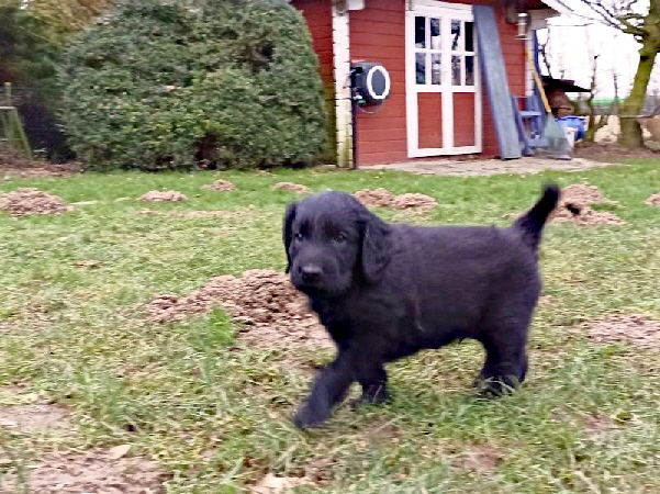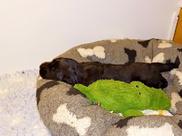 19.12.2021: Am liebsten ist Solo nun außerhalb der Wurfkiste im kleinen Auslauf. Da bekommt er viel mehr mit: die anderen Hunde, Menschen ... . Der Staubsauger interessiert ihn nun mal gar nicht. Ab und an, wenn er Seltsames wahrnimmt, bellt er mit heller Stimme - ganz schön gefährlich. Gefährlich sind auch die kleinen spitzen Zähnchen, autsch! Man sollte auch nicht die Besucher beißen, die jetzt schon da waren. Es könnten die neuen Frauchen und Herrchen dabei sein. Jedenfalls zaubert Solo den Leuten flugs ein Lächeln in’s Gesicht, einfach so. Und aufregend ist es auch. Die Leute sind natürlich begeistert. Er ist aber auch knuffig.