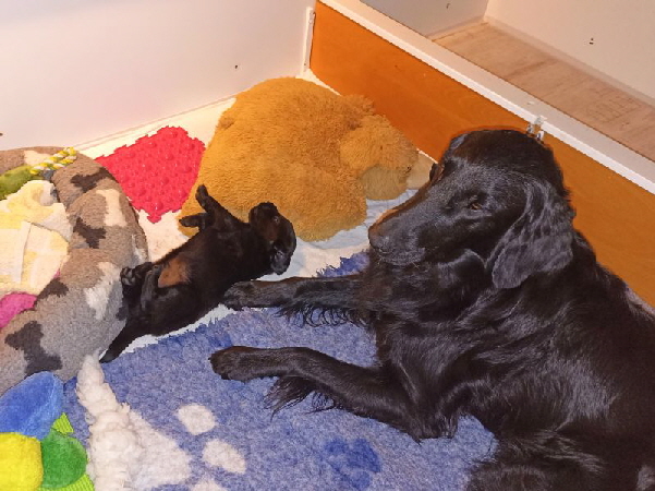 Bei den bisherigen Würfen war wegen der großen Zahl der Welpen fast immer etwas Unruhe. Wir mussten schauen, dass jeder Welpe genug zu Trinken bekam, fast ständig waren Geräusche zu hören und stets herrschte Sorge um die Kleinen. Nun richtet sich die Sorge nur auf einen Welpen. Also insgesamt ist alles deutlich ruhiger. Dana geht es gut, ihre OP-Naht ist sehr gut verheilt. Sie kümmert sich intensiv um Solo, hat aber auch Gelegenheit, sich außerhalb der Welpenkiste zu entspannen und auch mal durch den Garten zu streifen.