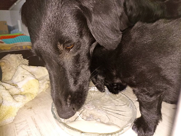 Seine Welt wird immer größer und er ist sehr interessiert. Es gab schon den ersten Ausflug in Wohnzimmer und Küche. Ganz schön mutig wird alles beschnuppert und inspiziert. Nun gibt es immer mehr Ergänzung zur Muttermilch, Ziegenmilchbrei, auch schon mit eingeweichtem Trockenfutter. Er putzt brav alles weg und hat 3 Kilogramm Gewicht erreicht - fein gemacht!